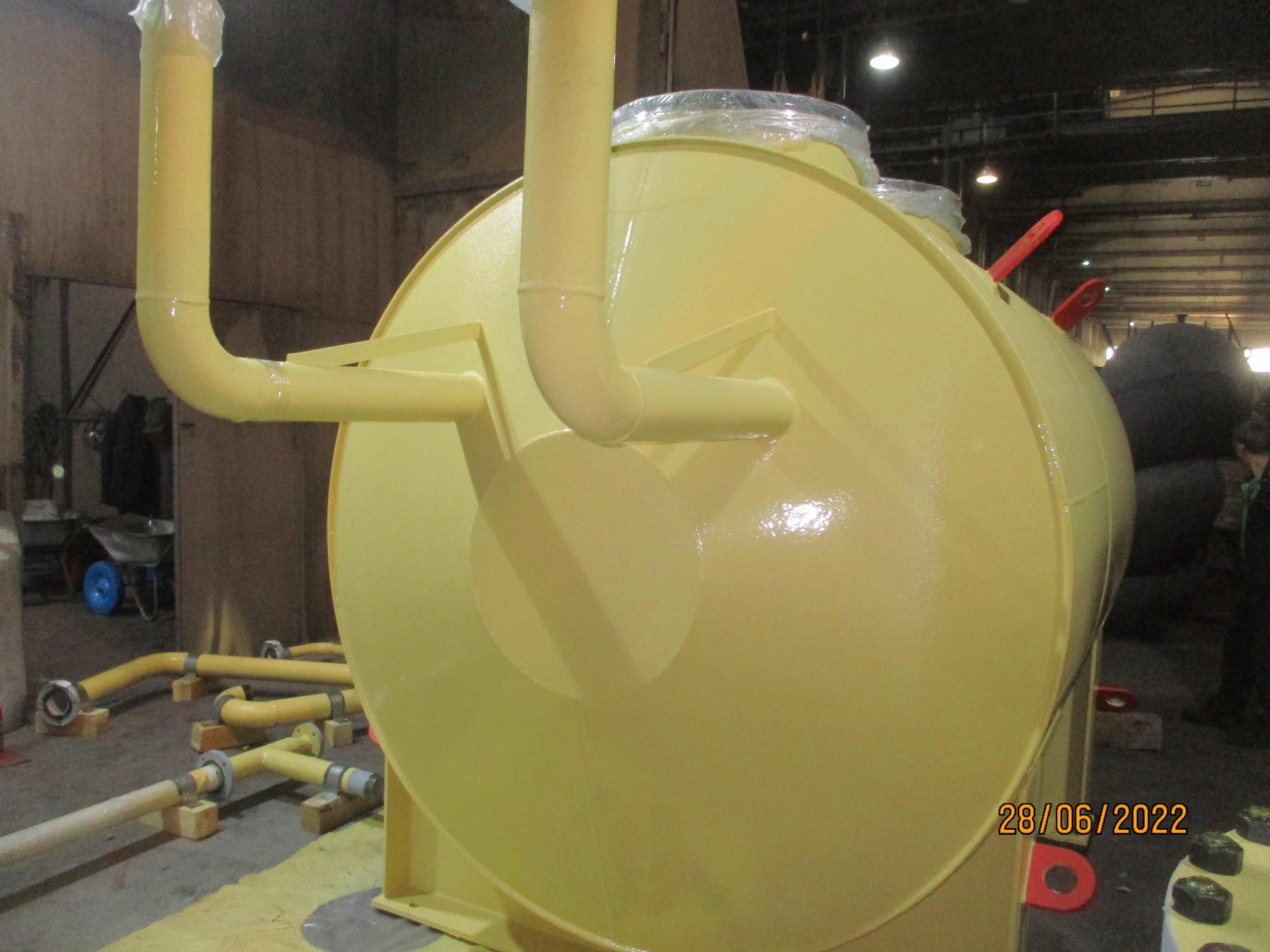 Емкости подземные конструктивно представляют собой полый цельносварной сосуд, работающий под давлением не выше 0,07 МПа, объемом до 200 м3, состоящий из металлического цилиндра и конических днищ. Для технологического обслуживания на верхней стороне обечайки, как правило, устанавливают два люка: один для слива хранимого продукта с помощью насоса, второй – для получения доступа внутрь для профилактического осмотра, технологического обслуживания и ремонта (очистка, продувка, промывка).