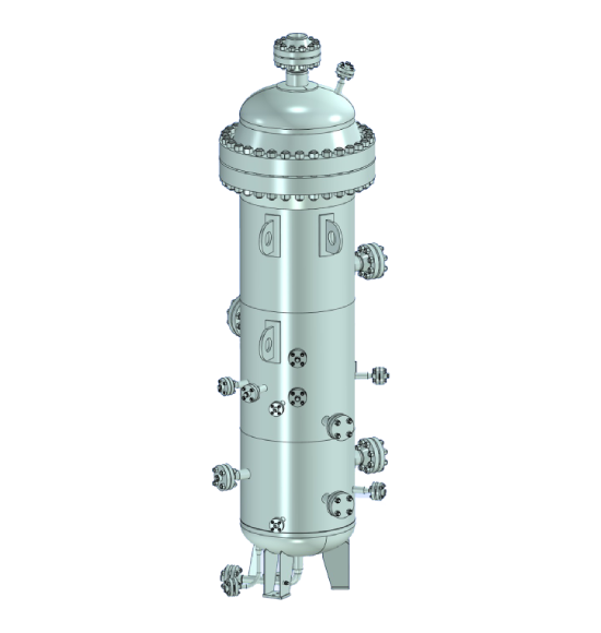 Газосепаратор представляет собой вертикальный цилиндрический аппарат, разделенный на несколько зон очистки газовой смеси. Крупные капли жидкости, поступающие с газом, отбрасываются на стенки аппарата, затем газовая смесь проходит первичную стадию сепарации в коагуляторе и попадает в секцию вторичной сепарации, в которой газ проходит дополнительную очистку в каплеулавливающей секции. Жидкость при этом стекает, попадая в секцию для ее сбора. Газосепараторы оснащены штуцерами отвода жидкости и газа, а также штуцерами для приборов КИП для обеспечения заданных режимов работы.